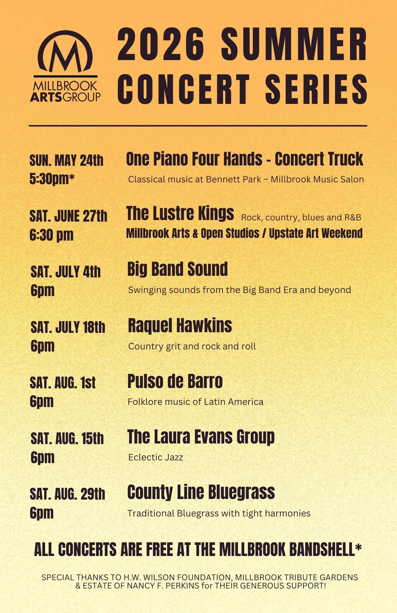 The 2025 season was no different, offering a vibrant mix of musical performances and expanding our multi-generational audience — and for the first time, it featured local food trucks adding delicious flavor to the evenings. Our 50/50 raffle was stronger than ever, and we’re deeply grateful to the many winners who generously donated their winnings back to MAG in support of our free summer concert programming. Together, we’re keeping the arts alive and accessible for all in Millbrook! We are looking forward to our 2026 season!